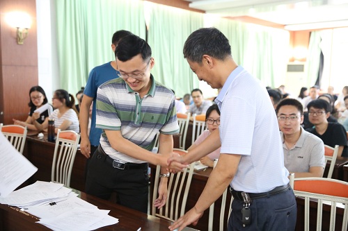 28日下午,段超主任做了题为《玉经琢磨乃成器,剑拔深埋方倚天》的精彩报告。他根据多年的班主任工作经历,以备赛、工作和生活三方面为切入点,用通俗幽默的语言、生动精彩的案例,讲述了班主任应该如何提升能力、积极备赛,如何传道授业、管理学生,如何陶冶性情、升华自我。段主任的讲座全面展示了一名优秀班主任的基本素养,他的交流与参训老师产生强烈共鸣,会场不时爆发出阵阵掌声。